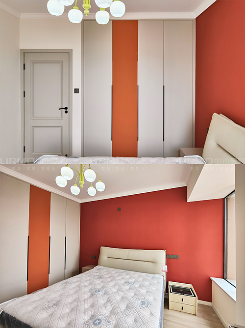 臥室朱紅色的背景搭配一門到頂跳色柜門,簡直不要太美啦!