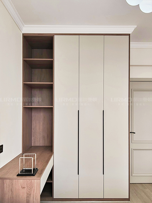 右側一門到頂膚感柜門,干凈又不失質感,滿滿的收納空間。