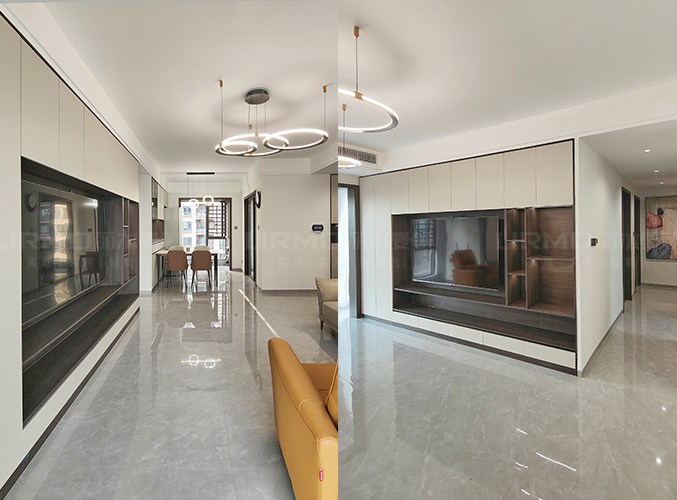 全屋通鋪瓷磚,視覺(jué)上看起來(lái)更顯大氣,電視背景墻采用整面墻做儲(chǔ)物柜設(shè)計(jì),整體效果不顯沉悶,