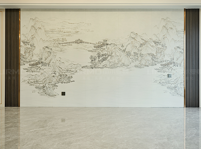 沙發背景墻帶有山水畫,增加整體的格調。