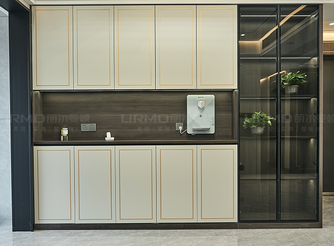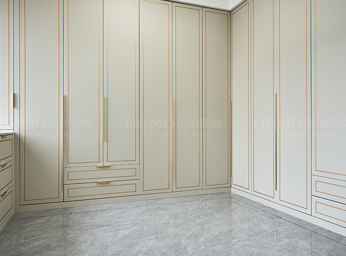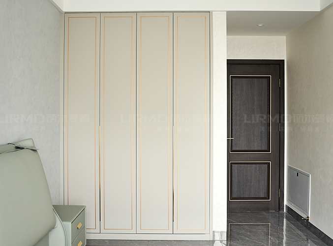 墻柜一體化,象牙灰柜門鑲嵌金屬邊框,與柜門同款式,尤加利護墻板同色配套房門柜體更顯精致,