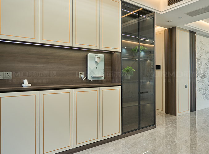 側面做整面墻的餐邊柜,搭配局部玻璃柜門收納展示兩不誤。