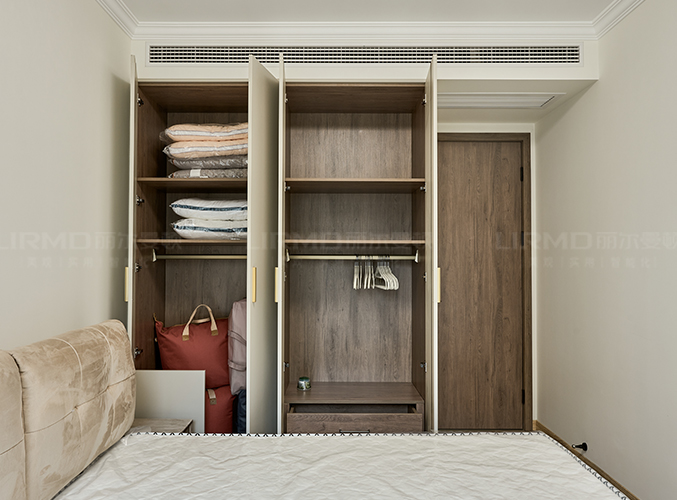 18mm厚杉木芯板,實木柜體搭配PET膚感柜門,下方懸空設計,好放置鞋子,中間內嵌設計,