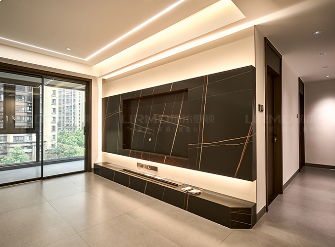 電視背景墻采用黑色紋理石板點綴空間,整墻做內嵌電視背景墻,不占空間,