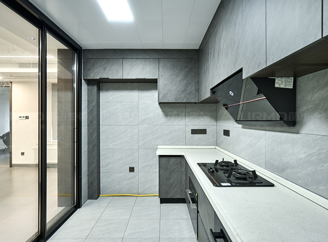 U型設計,櫥柜灰色超晶飾面搭配淺色橫磚整體統一,上下都有柜子,方便收納。