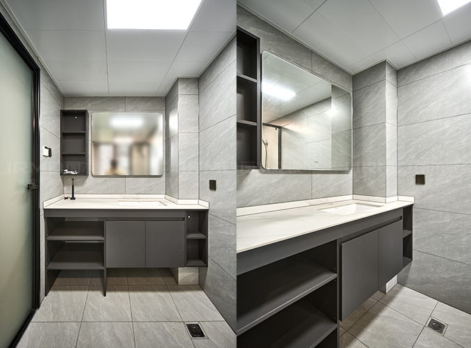 啞光淺灰地磚大氣整潔,疊級吊頂+無主燈設計增添高級感。