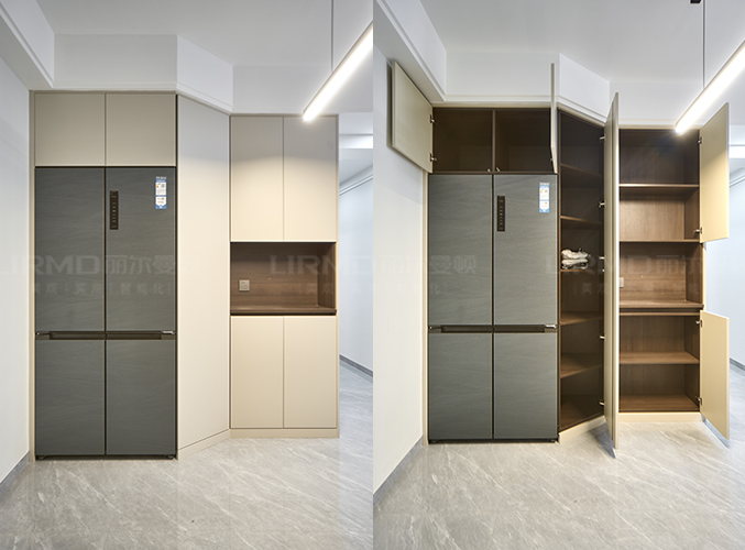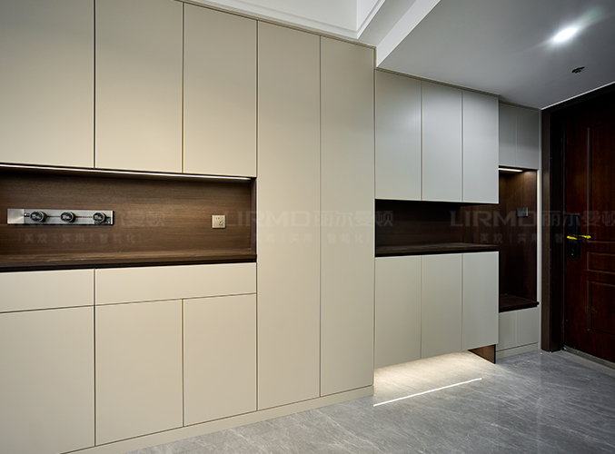 18mm厚杉木芯板,入戶鞋柜+餐邊柜的設(shè)計(jì),大大提升了收納空間,鞋柜下方懸空設(shè)計(jì),