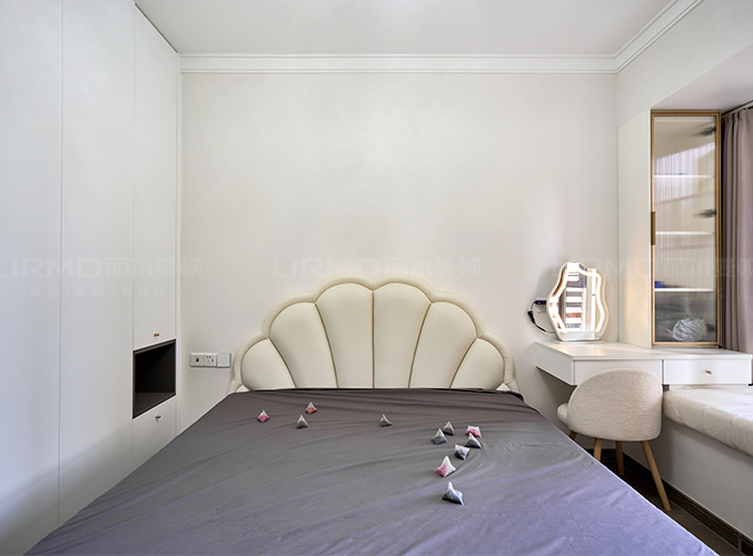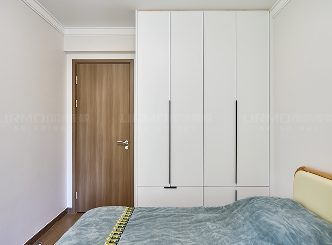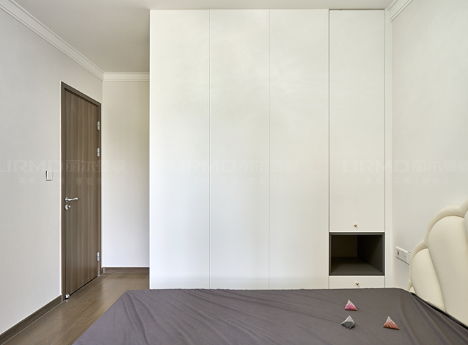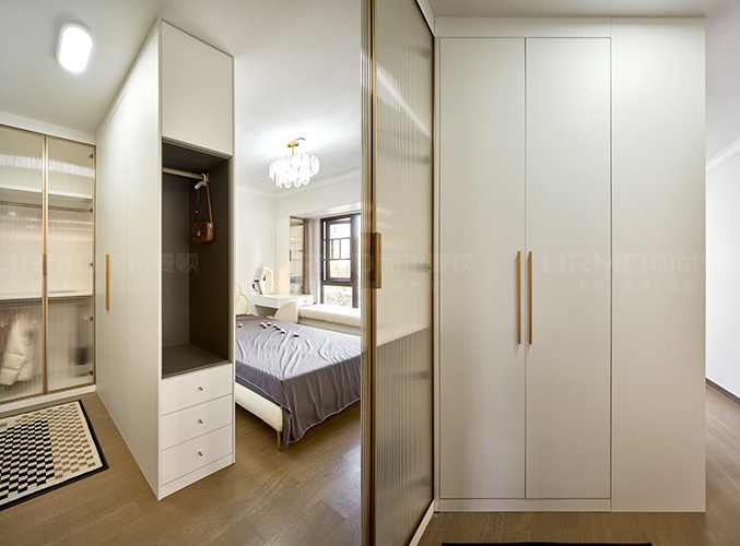 入式衣帽間,方便收納更多衣物、包包等,反面一門到頂衣柜,靠窗做懸空梳妝臺(tái),