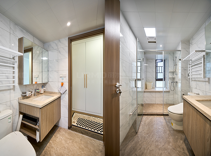 白色答題時(shí)搭配木紋柜子,暖色燈光讓氛圍溫馨清爽。