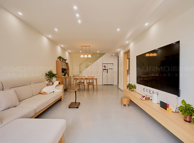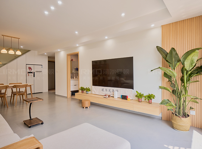 電視背景懸浮柜設計,整塊墻做電視背景墻,盡顯大氣,無主燈設計搭配大白墻,