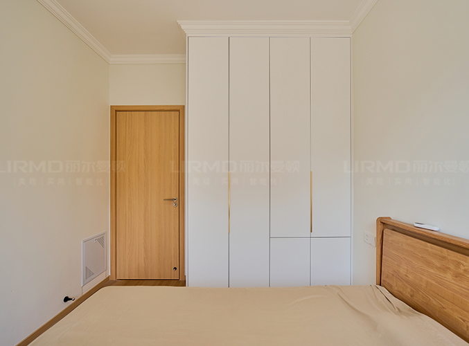 臥室整體原木+奶白,實木柜體搭配PET膚感柜門,一門到頂,質感超不錯,