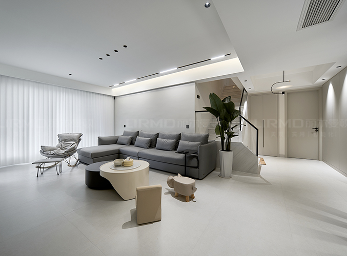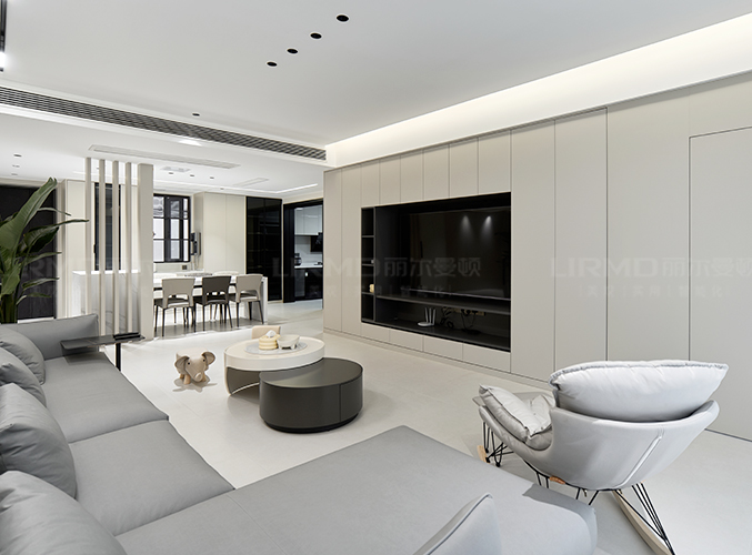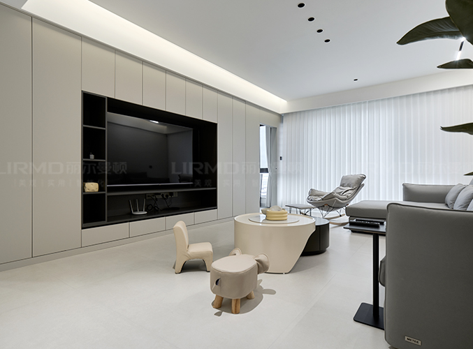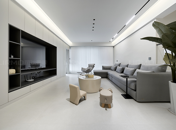 整屋通鋪瓷磚,整墻電視背景墻設計,左邊內嵌式柜子,可擺放綠植和小物件,