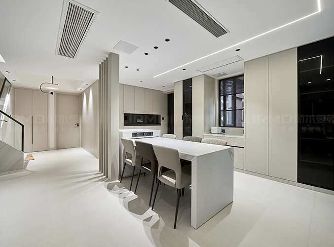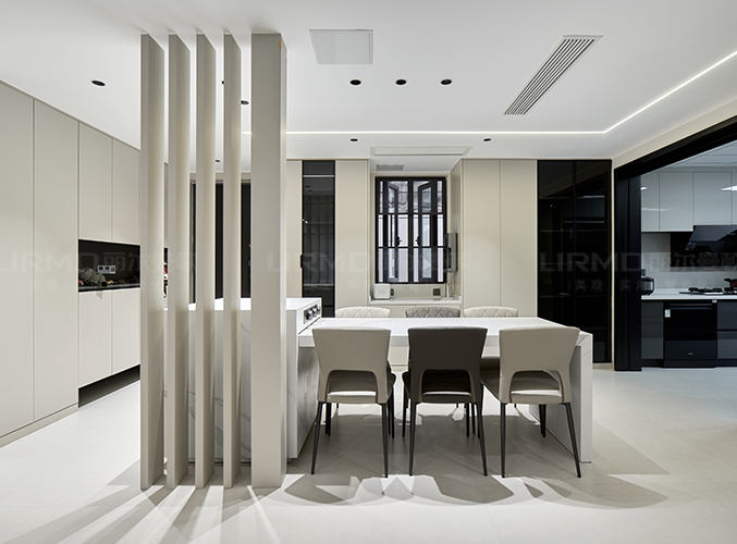 餐廳整墻做餐邊柜,島臺餐桌一體,可推拉調節餐桌長度,滿足多人聚餐需求。