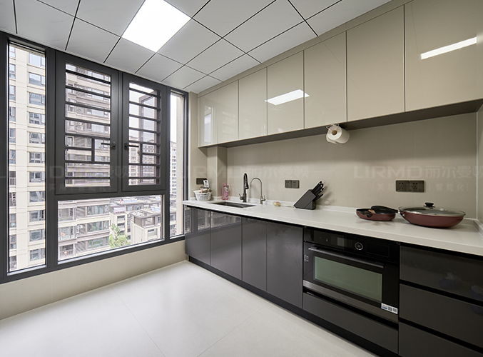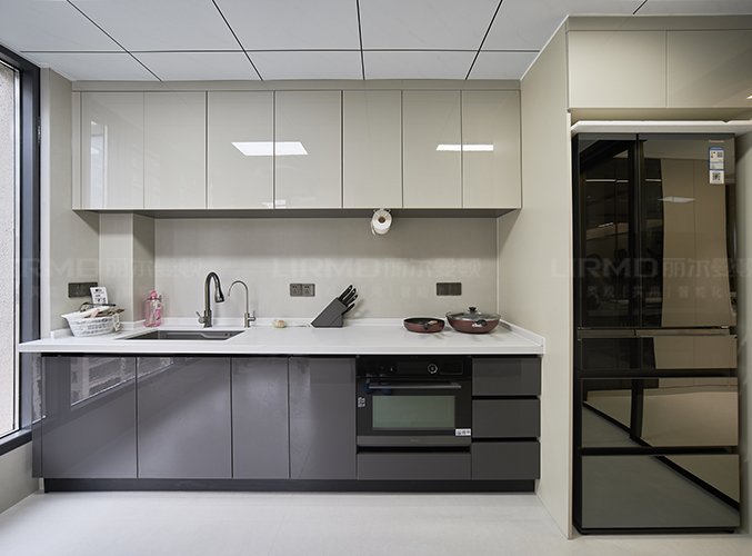 上下方都有收納柜,視覺層次更加豐富,搭配大理石臺面美觀又實用,內嵌式冰箱不占空間。