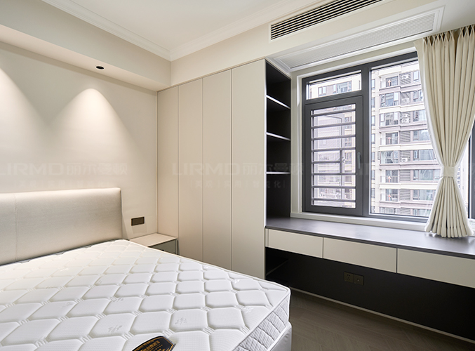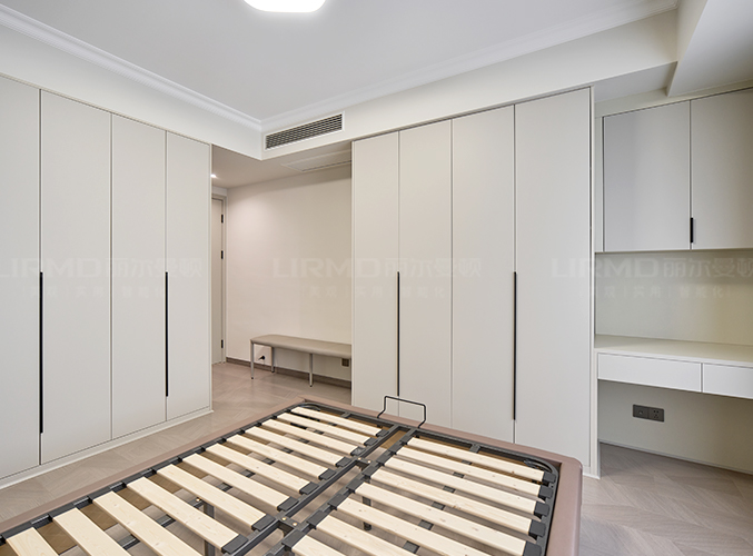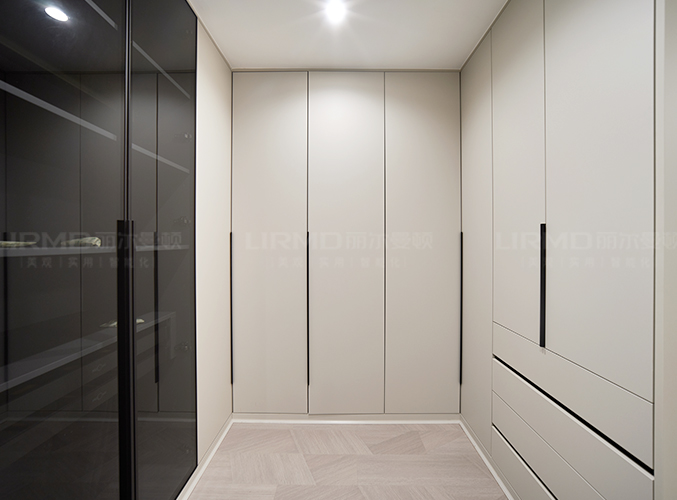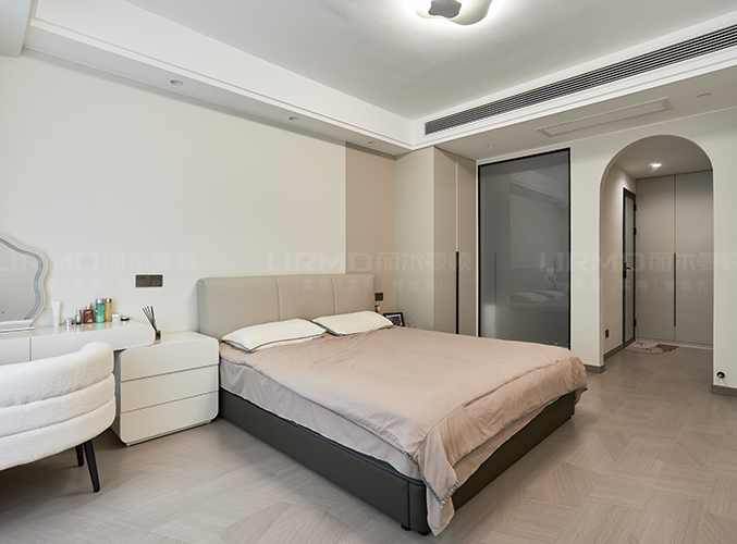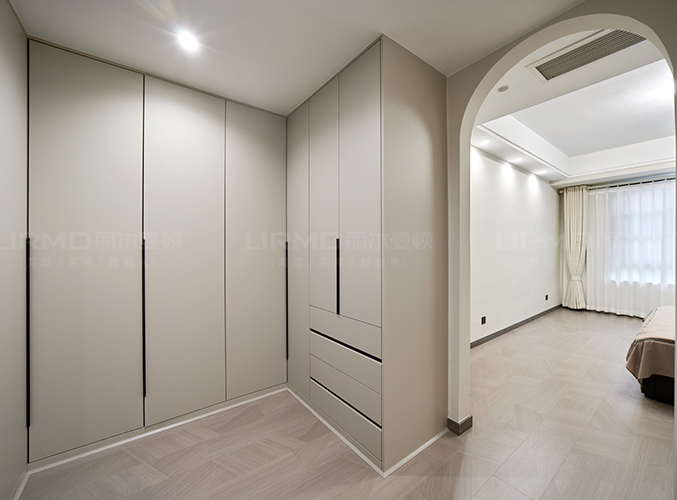 臥室拱形門分割衣帽間,滿墻衣柜實現門墻柜一體化,整體統一高級。