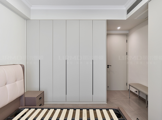 實木柜體搭配PET膚感柜門,多組一門到頂衣柜+床頭柜的組合,收納更加方便。
