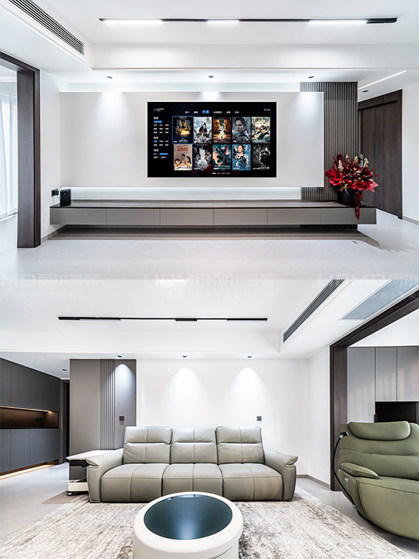 木紋護墻板搭配極簡線條設計,空間以質感與奢雅為基調,簡潔的設計、利落的線條,低調奢華與精致優雅共生