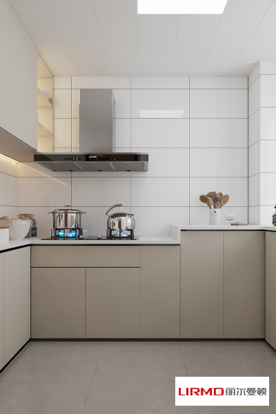 廚房設計以簡約大方為主,大面積的淺色瓷磚使用使空間看起來更開闊,