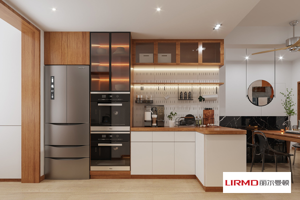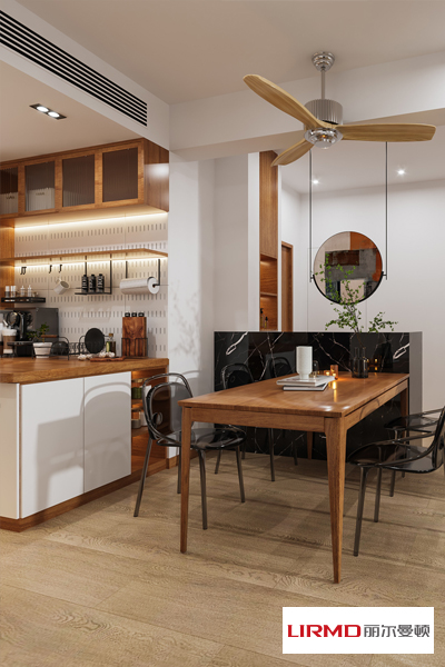 客餐廳形成開放式格局,使整個空間融為一體,光線通透性更強,視覺上顯得更大。餐廳延續了整體的色彩組合,通過溫馨的原木色與白色搭配,營造出和諧舒適的就餐氛圍,整體氛圍現代、復古而富有溫度。木質餐邊柜與餐桌形成流暢的使用動線,餐邊柜的用途多樣,中間鏤空處可以放微波爐、咖啡機、熱水壺等,封閉柜體不僅是廚房的補充收納,還是公用物品的集合收納區。備餐臺上下方均設置柜體,冰箱與烤箱的鑲嵌于櫥柜內,將空間完全利用,規整的布局使整個空間更看上去更具條理。
