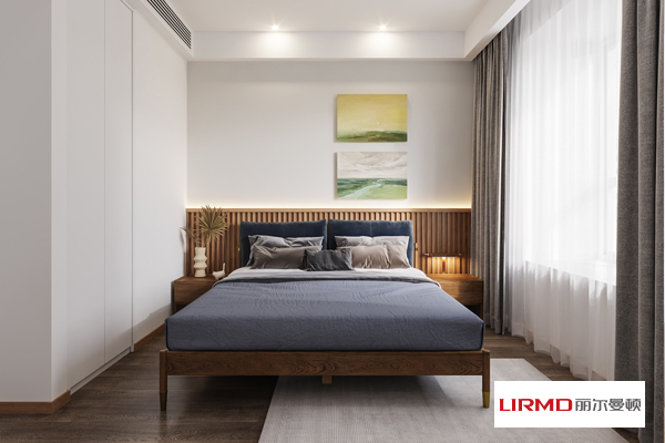 灰色床品,簡單不失品味,木飾床頭散發出寧靜氣息,光線透過紗簾在臥室自由流轉,一切都剛剛好。